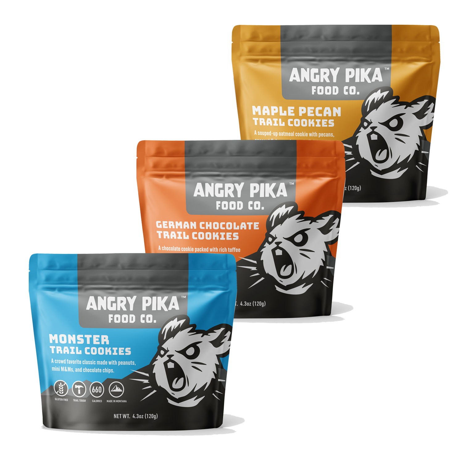 Angry Pika Trail Cookies are the only cookie custom made for life on the trail. They are super durable, contain lots of fat and protein for sustained energy, and taste amazing! Unlike candy bars and granola bars, our Trail Cookies can be easily eaten in both hot and below freezing temperatures. Each 4.3oz pouch contains 8 cookies.