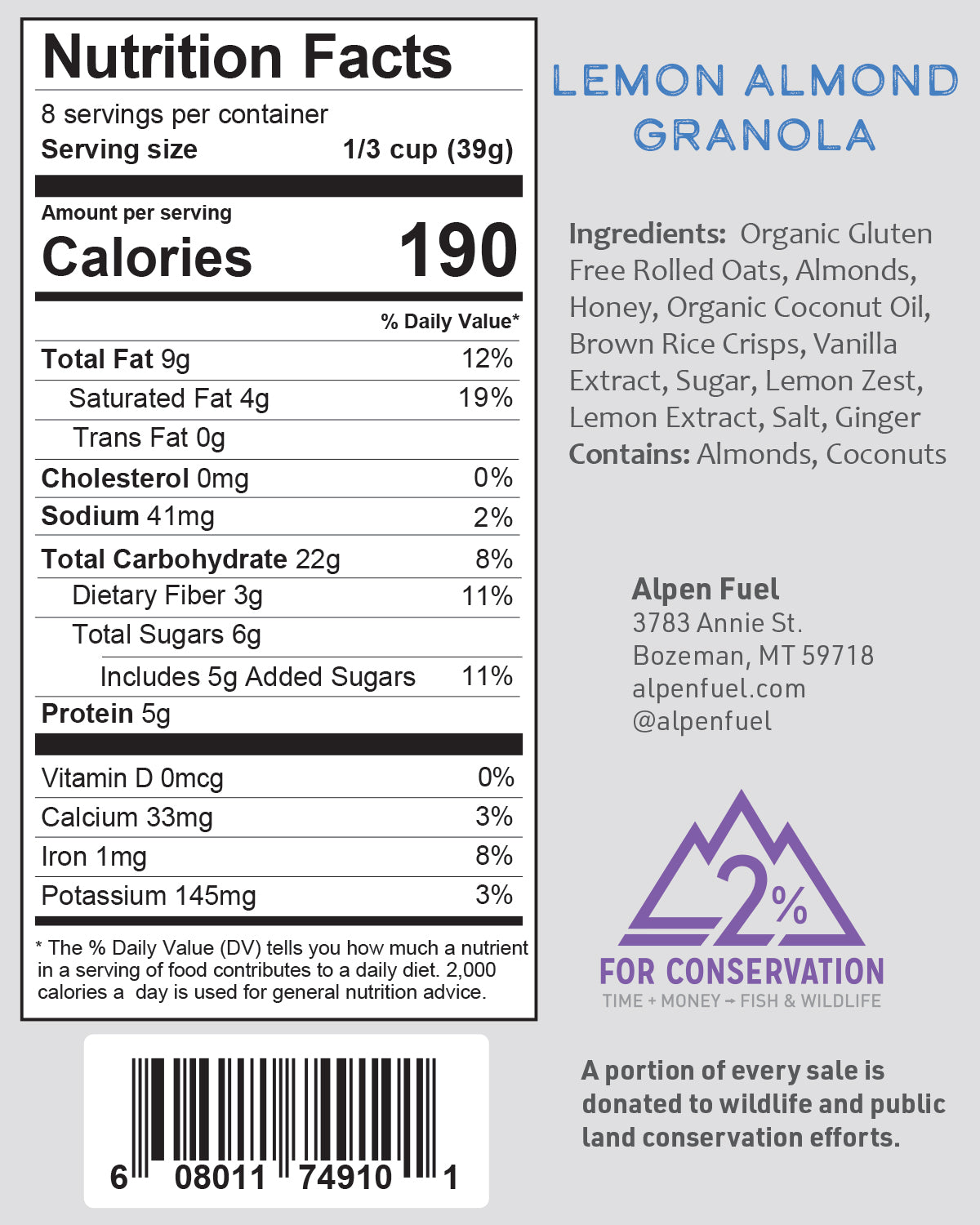 Alpen Fuel bulk granolas are the home version of our amazing backpacking granolas!  Each 10oz package is loaded with tasty and filling granola (the pouch does NOT contain powdered milk or freeze dried fruit like our backpacking meals), and is perfect for a quick breakfast, snack, or a tasty topping for ice cream or yogurt!